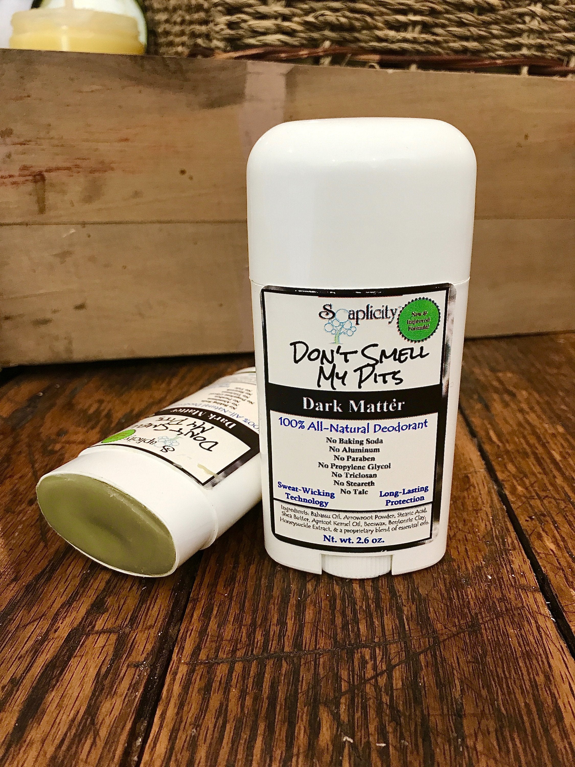 Dark Matter is an all-natural deodorant that works harder and lasts longer than other all natural deodorants. Dark Matter is our #1 seller because men and women both love the deep, tangy tangerine and patchouli scent. Made with only all-natural, sustainable ingredients that you can pronounce, our entire line of Don't Smell My Pits all natural deodorants make you feel good, smell good, and work wonders. Each boasts long-lasting odor-fighting protection and sweat-wicking technology all in a 2.6 oz. stick. That's right. You don't have to touch your pits either. You're welcome.